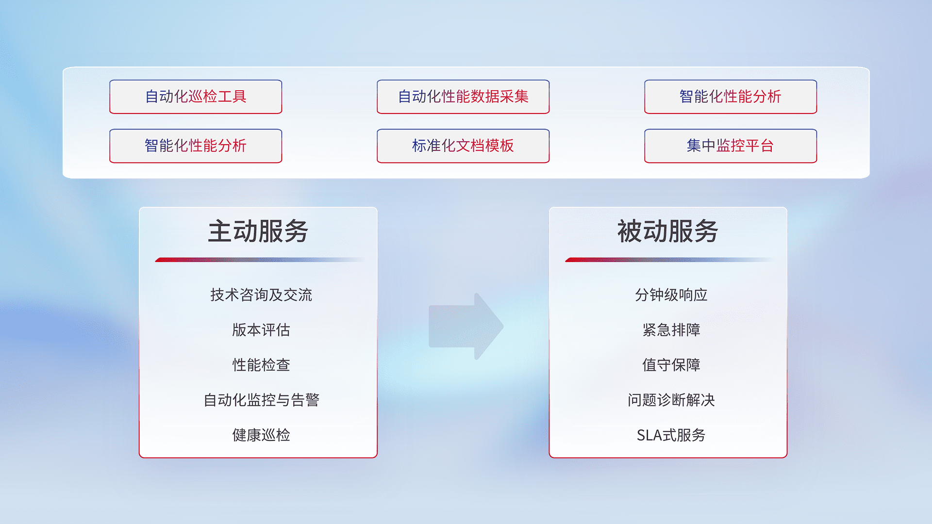 智能化工具和标准化文档,,,,保障服务质量,,,提供主动服务(包含技术咨询、、、版本评估、、性能检查、、自动化监控与告警、、、健康巡检)和被动服务包含(分钟级响应、、、紧急排障、、值守保障、、、、问题诊断解决、、SLA服务)。。。。