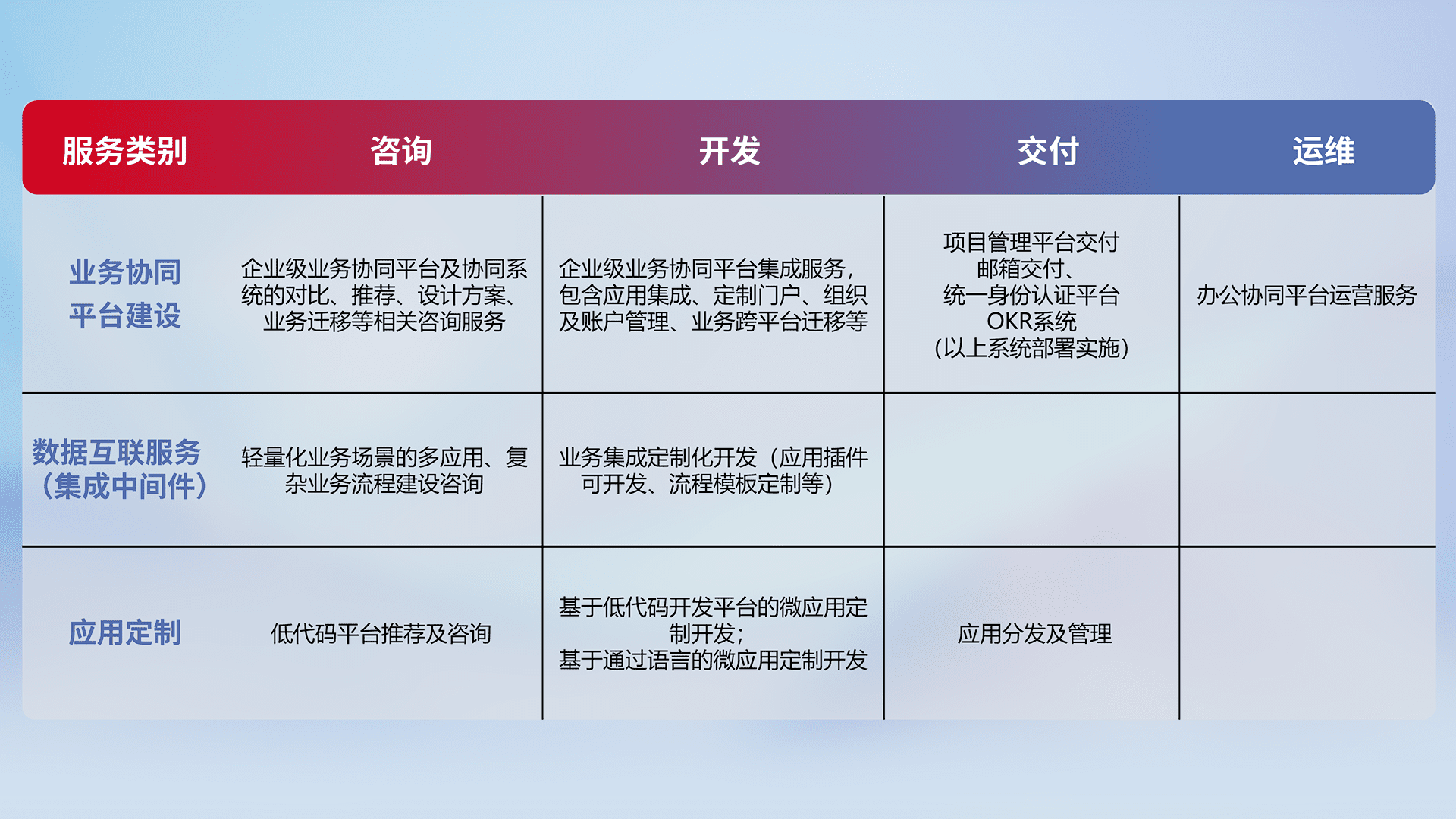 针对钉钉、、、、企微、、、、IDaas等平台级产品提供产品的规划、、、、方案、、、、交付、、、定制化开发等服务,,,实现如统一协同办公、、、智能客户服务、、、混合会议管理、、智能数据查询、、等业务场景,,实现数字化转型。。。